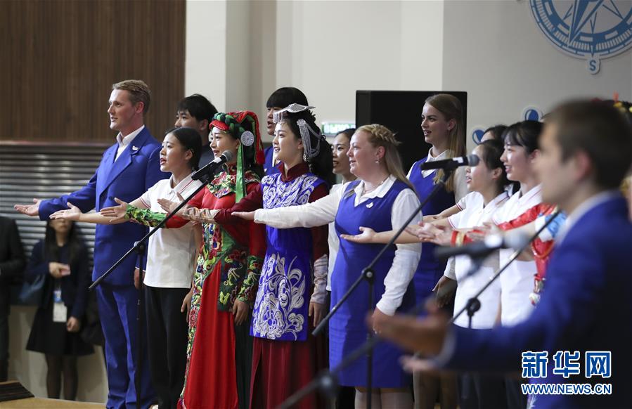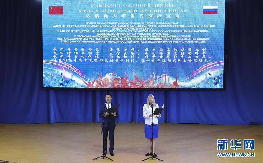 席浚斐和儿童中心辅导员娜塔莉亚共同宣读《中俄青少年世代友好宣言》,声音铿锵,在剧场里久久回荡。