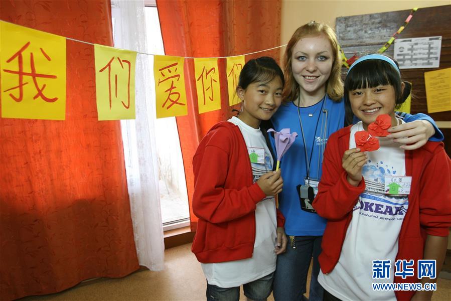 2008年7月21日,在“海洋”全俄儿童中心,两个中国小姑娘和她们的折纸课老师合影留念。 新华社记者郑悦摄