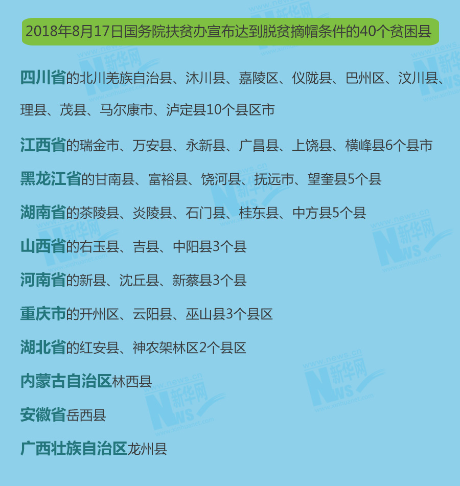 国务院扶贫办副主任夏更生表示,此次实现脱贫的40个县是:四川省的北川羌族自治县、沐川县、嘉陵区、仪陇县、巴州区、汶川县、理县、茂县、马尔康市、泸定县10个县区市,江西省的瑞金市、万安县、永新县、广昌县、上饶县、横峰县6个县市,黑龙江省的甘南县、富裕县、饶河县、抚远市、望奎县5个县,湖南省的茶陵县、炎陵县、石门县、桂东县、中方县5个县,山西省的右玉县、吉县、中阳县3个县,河南省的新县、沈丘县、新蔡县3个县,重庆市的开州区、云阳县、巫山县3个县区,湖北省的红安县、神农架林区2个县区,内蒙古自治区林西县,安徽省岳西县,广西壮族自治区龙州县。
