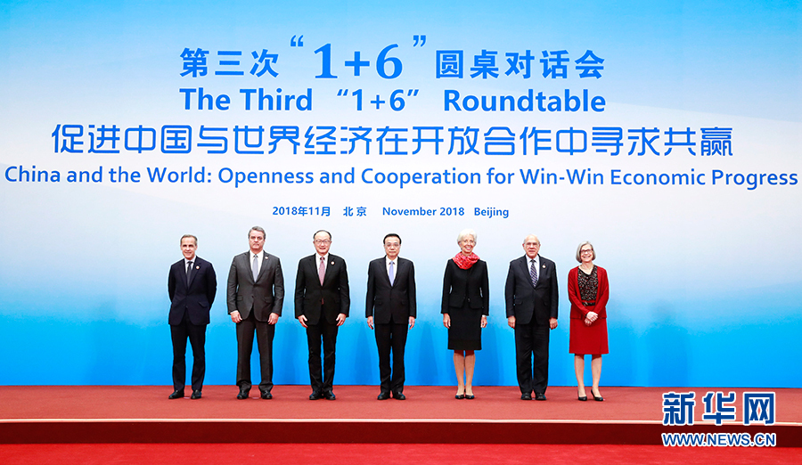新华社北京11月6日电(记者郑明达)国务院总理李克强6日下午在钓鱼台国宾馆同世界银行行长金墉、国际货币基金组织总裁拉加德、世界贸易组织总干事阿泽维多、经济合作与发展组织秘书长古里亚、金融稳定理事会主席卡尼和国际劳工组织副总干事格林菲尔德举行第三次“1+6”圆桌对话会。会议围绕“促进中国与世界经济在开放合作中寻求共赢”的主题,就中国经济和改革开放等议题深入交流。