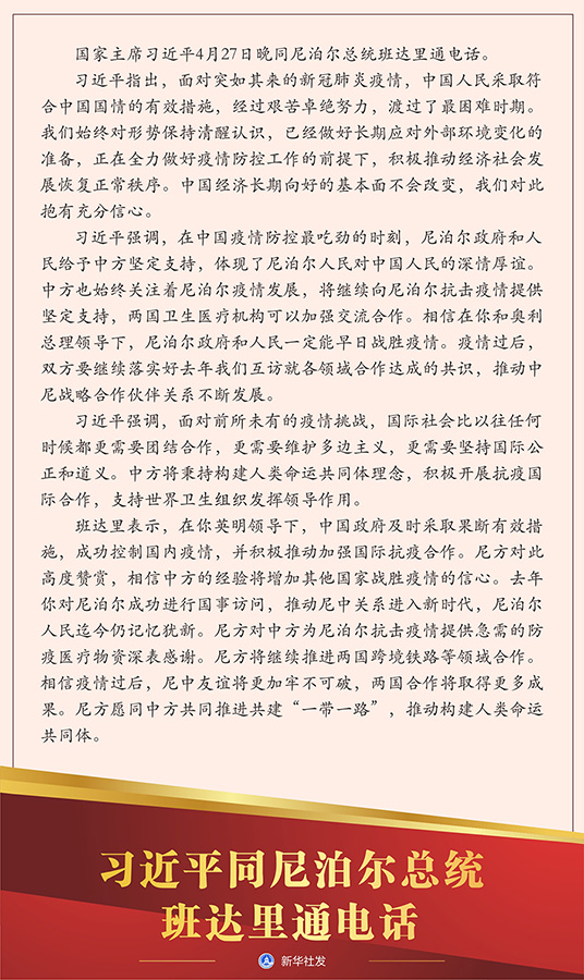 新华社北京4月27日电 国家主席习近平27日晚同尼泊尔总统班达里通电话。