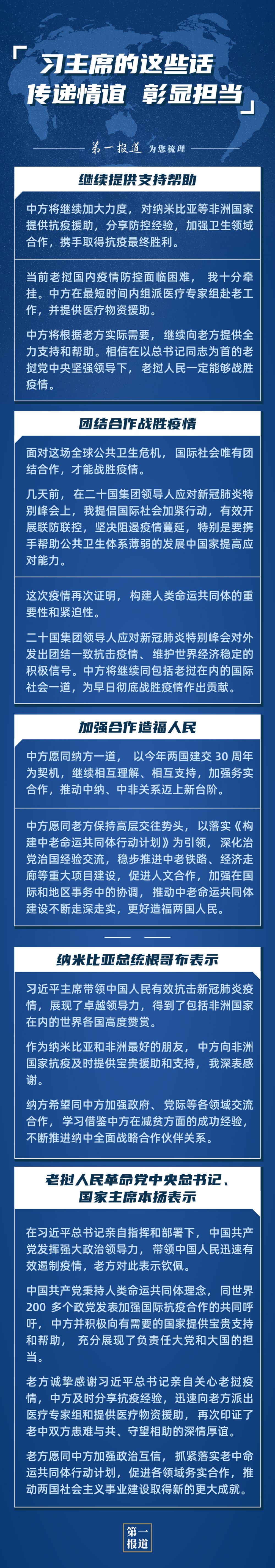 习近平指出,在中国疫情防控形势最艰难时刻,非洲国家向中国提供了不少宝贵支持,我们对此铭记在心。我非常关心当前非洲疫情形势。中方克服困难,积极向非盟和非洲国家提供抗疫物资援助,组织专家视频会议交流经验,中国企业和民间机构也纷纷向非洲国家伸出援手。这些都是中非命运共同体的真实写照。中方将继续加大力度,对纳米比亚等非洲国家提供抗疫援助,分享防控经验,加强卫生领域合作,携手取得抗疫最终胜利。相信通过共同抗击疫情,中国同纳米比亚和非洲国家的友谊将进一步深化。中方愿同纳方一道,以今年两国建交30周年为契机,继续相互理解、相互支持,加强务实合作,推动中纳、中非关系迈上新台阶。