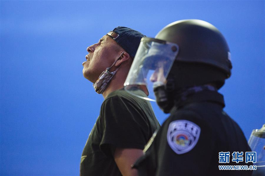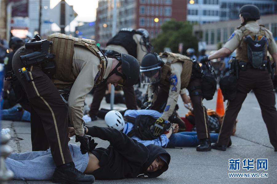 5月31日,在美国明尼苏达州明尼阿波利斯市,示威者被警察逮捕。 新华社发(安格斯·亚历山大摄)