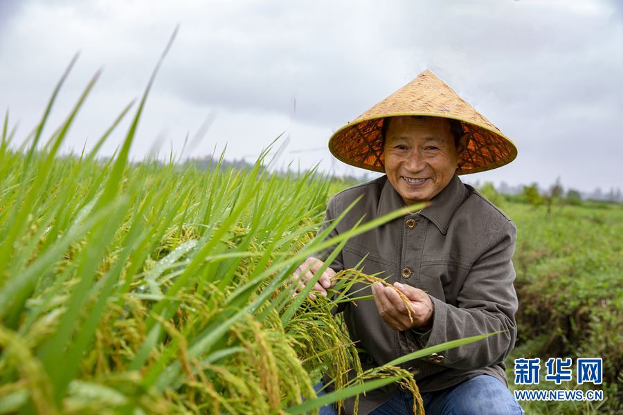 9月22日,湖南省岳阳市湘阴县鹤龙湖镇南洲村,李昌浩查看水稻长势。新华社发(曾丹 摄)