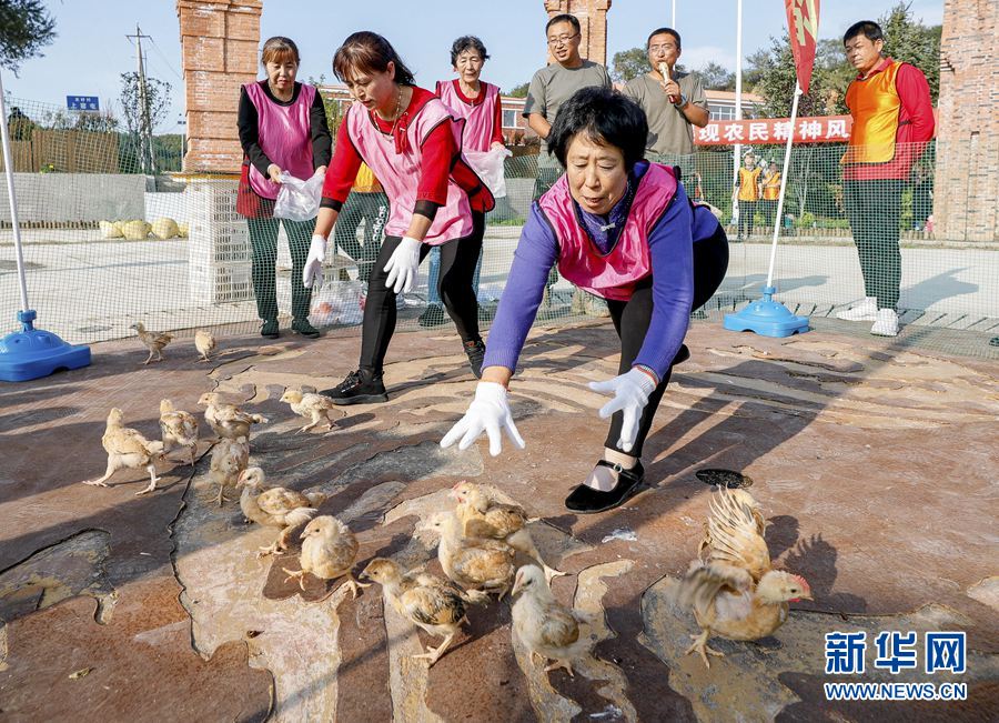 9月23日,参赛选手在趣味运动项目“‘鸡’不可失”比赛中。当日,一场别开生面的农民趣味运动会在吉林省长春市净月高新技术产业开发区玉潭镇友好村举行,来自周边多个村镇的近百名参赛选手在六个取材于农村日常生活的趣味运动项目中一决高下,在欢声笑语中喜迎收获季的到来。 新华社记者 许畅 摄