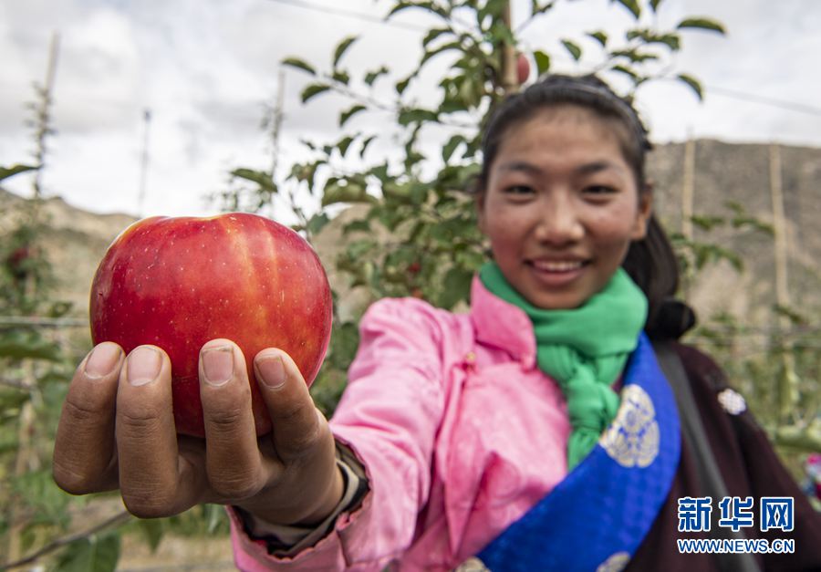 9月23日,一名搬迁群众在展示刚刚采摘的苹果。 金秋丰收季,在西藏山南市贡嘎县森布日村,森布日搬迁安置点附近的千亩矮化苹果种植园迎来丰收。森布日搬迁安置点是西藏极高海拔地区居民生态搬迁安置点之一。2018年6月,西藏开始实施极高海拔生态搬迁项目。2019年底,来自那曲市安多县色务乡,双湖县嘎措乡、雅曲乡、措折强玛乡的共计957户、4058名群众搬迁至此。 矮化苹果种植园是山南市森布日极高海拔生态搬迁点经济林种植基地建设项目的一部分,目前委托给西藏康其农业发展有限公司管理运营。果园收入的65%将作为分红交给搬迁群众。 新华社记者 孙非 摄