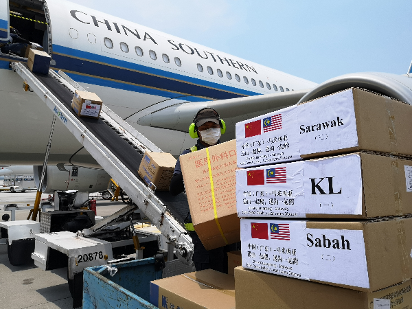 4月18日,在马来西亚吉隆坡国际机场,地勤人员搬运中国政府向马来西亚派遣的抗疫医疗专家组带来的物资。新华社发(中国驻马来西亚大使馆供图)
