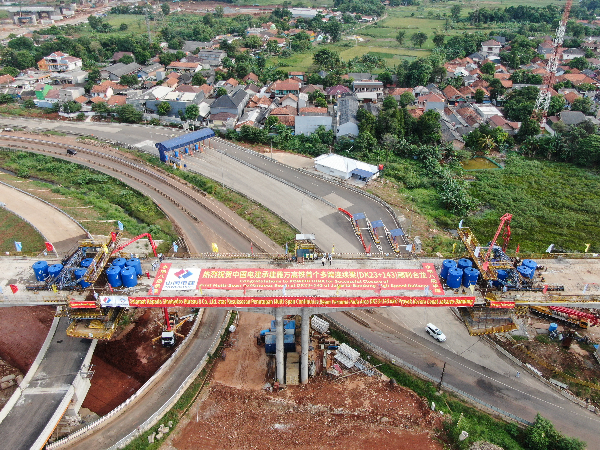 这是2020年5月10日拍摄的印度尼西亚雅万高铁首个多跨连续梁合龙现场。雅万高铁项目是中国高铁全系统、全要素、全生产链走出国门的“第一单”,也是“一带一路”倡议的标志性工程和印尼国家战略项目。新华社记者 杜宇 摄