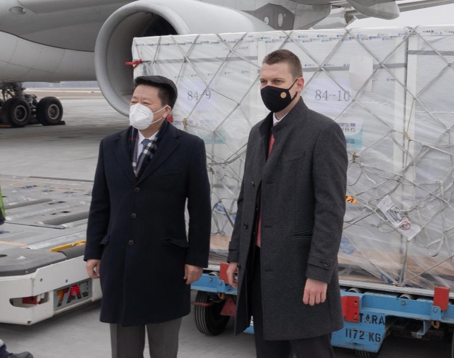 匈牙利外交与对外经济部国务秘书门采尔·陶马什和中国驻匈牙利大使齐大愚到机场迎接中国疫苗。