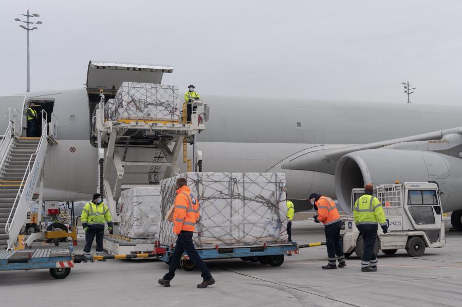 2月16日,在匈牙利首都布达佩斯,机场工作人员卸载中国出口匈牙利的首批新冠疫苗。新华社发