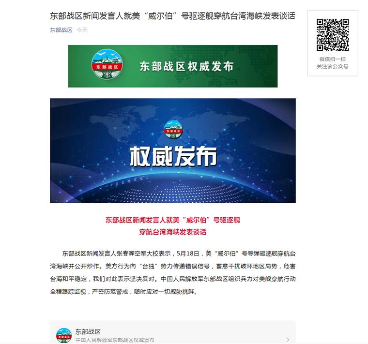 东部战区新闻发言人张春晖空军大校表示,5月18日,美“威尔伯”号导弹驱逐舰穿航台湾海峡并公开炒作。美方行为向“台独”势力传递错误信号,蓄意干扰破坏地区局势,危害台海和平稳定,我们对此表示坚决反对。中国人民解放军东部战区组织兵力对美舰穿航行动全程跟踪监视,严密防范警戒,随时应对一切威胁挑衅。