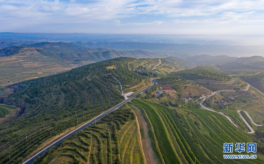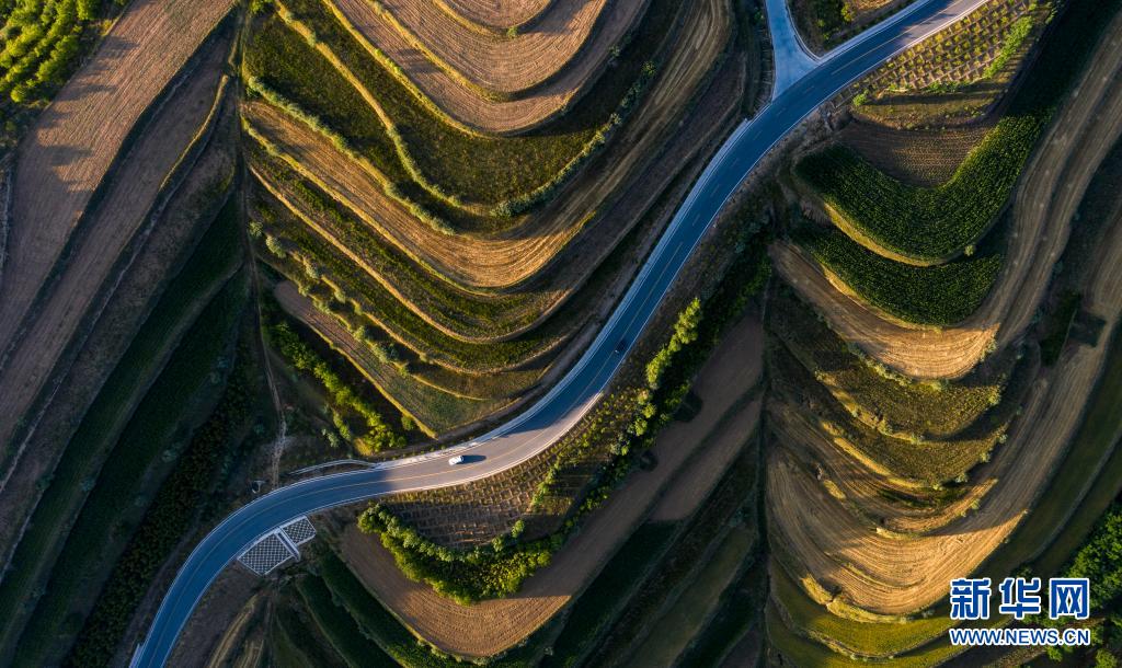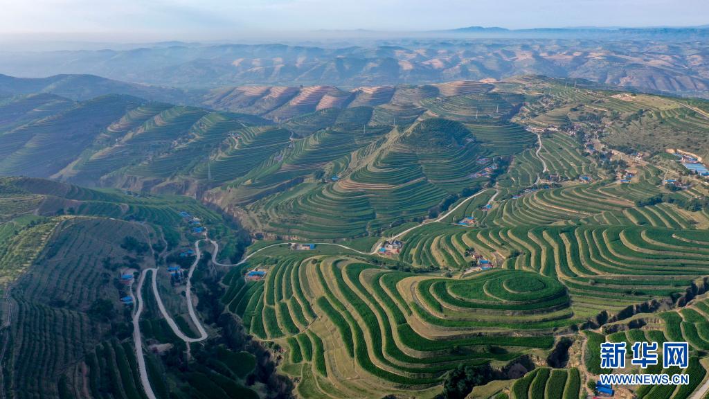 这是7月14日在宁夏固原市彭阳县拍摄的青云湾旱作梯田公园(无人机照片)。新华社记者 冯开华 摄