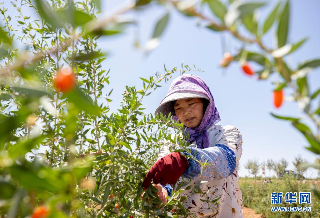 7月1日,采摘工在宁夏中宁县玺赞生态枸杞庄园采摘枸杞。新华社记者 杨植森 摄
