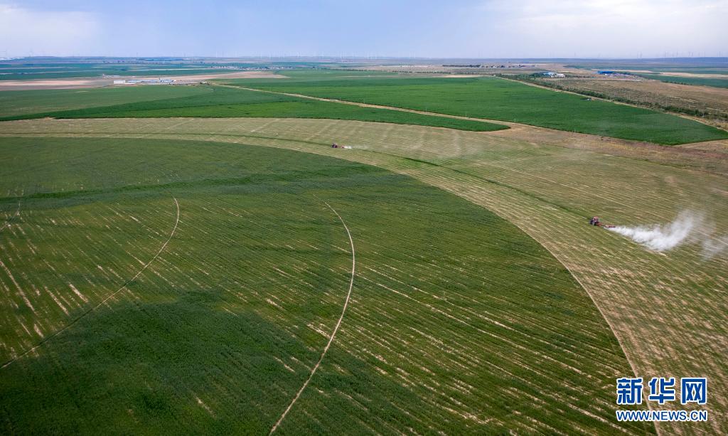 在宁夏盐池县冯记沟乡平台村的优质牧草基地,农户用机械收割牧草(无人机照片,7月14日摄)。新华社记者 杨植森 摄