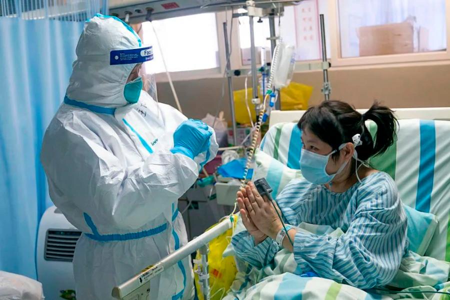 2020年1月24日,在湖北省武汉大学中南医院重症隔离病房,中南医院重症医学科主任彭志勇(左)与病情好转的患者黄淑丽互道新春快乐。新华社记者 熊琦 摄
