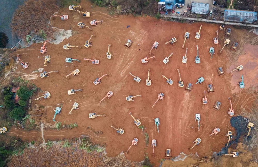 2020年1月24日,在湖北省武汉市火神山医院建设工地,大型机械加紧施工(无人机照片)。新华社记者 肖艺九 摄