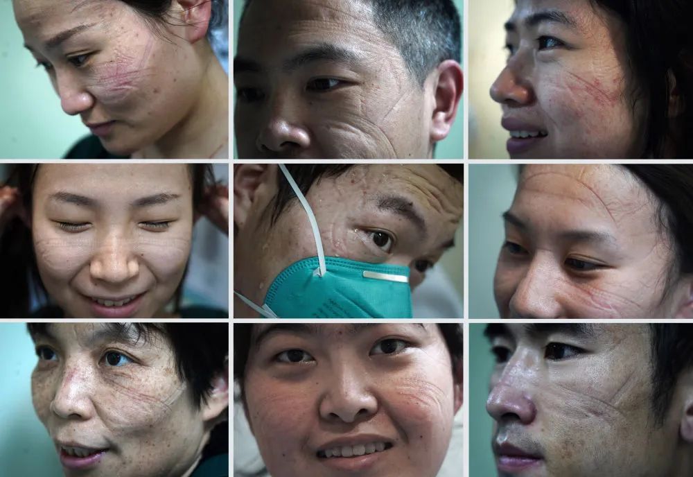 这是2020年2月6日拍摄的江西省南昌大学第一附属医院象湖院区隔离病房重症监护室医护人员脸上被护目镜和口罩压出的印痕(拼版照片)。新华社记者 万象 摄