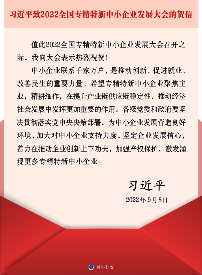 新华社南京9月8日电 2022全国专精特新中小企业发展大会8日上午在江苏省南京市开幕。中共中央总书记、国家主席、中央军委主席习近平发来贺信,表示热烈祝贺。