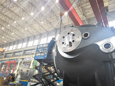 哈电集团哈尔滨电机厂有限责任公司水电分厂,工人在球阀上作业 。记者 强勇 摄