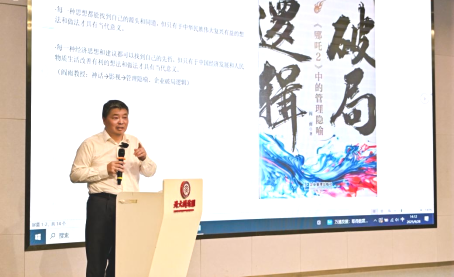 北京大学经济学院经济史学系主任、博士生导师、中国经济思想史学会会长周建波教授发表演讲《经济思想史视阈下的破局之道:解析〈哪吒 2〉中的传统管理智慧》。他从经济思想史视角解析《哪吒 2》,将传统“儒墨道法”思想、现代社会发展议题与影片中的管理隐喻结合,提出 “从历史智慧中寻找破局钥匙”。