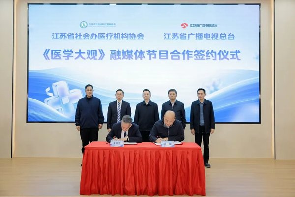 江苏省广播电视总台生活广播部主任胡骏与江苏省社会办医疗机构协会副会长兼秘书长朱明志签署合作协议