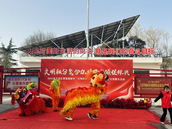 春节临近,铜川市王益区黄堡镇新村却提前热闹了起来。村委会大院里,锣鼓点铿锵有力,一头色彩斑斓的“雄狮”正踩着节奏欢腾跳跃——这是当地市级非遗石坡舞狮的表演,也为一场别开生面的“文明积分”示范户风采展示暨文明集市活动拉开了序幕。