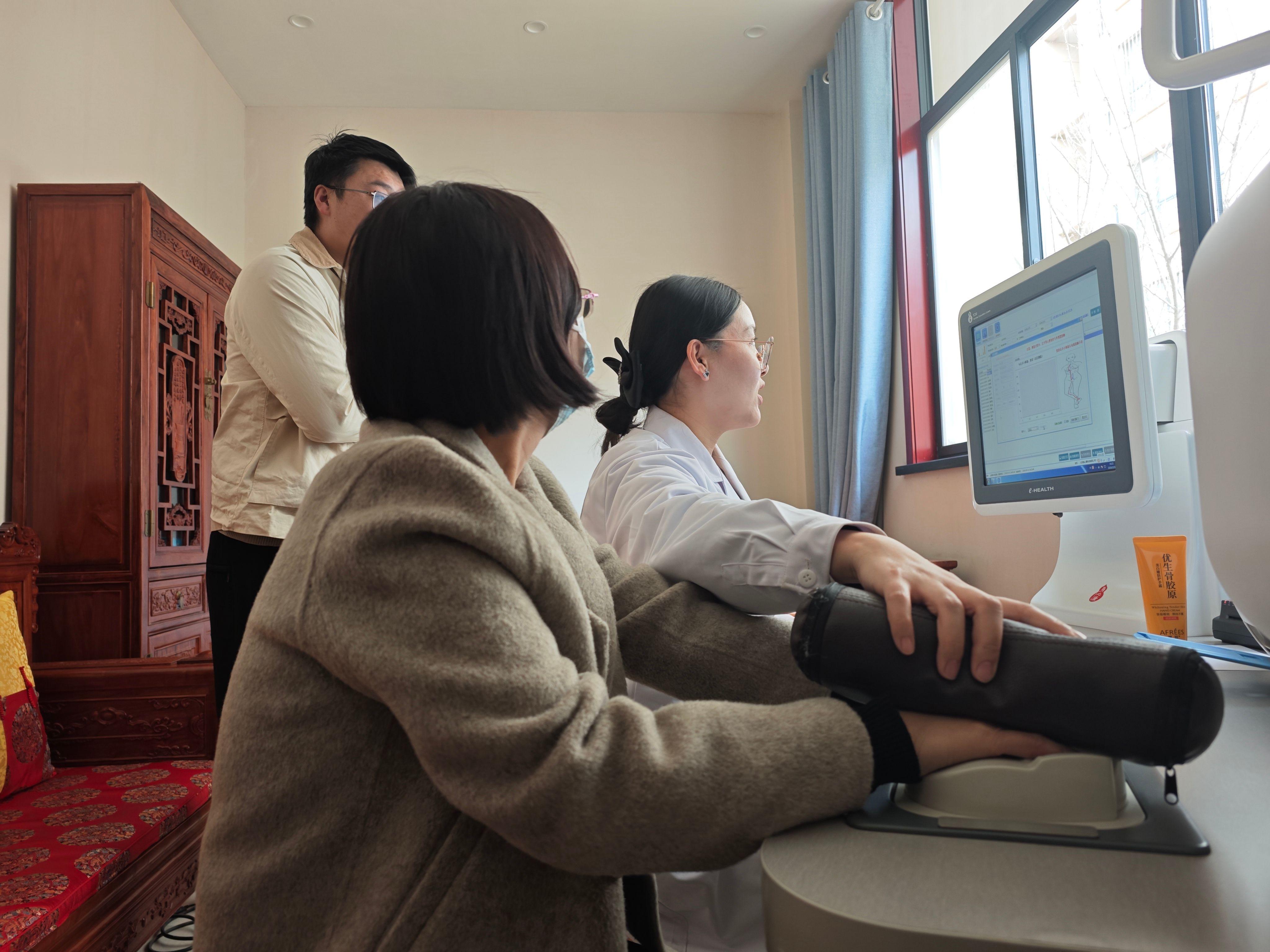 在经络测评室内,医师通过中医经络检测设备分析系统,为患者科学精准研判身体健康状况,并根据系统出具的数据和建议为患者提供个性化调养方案。