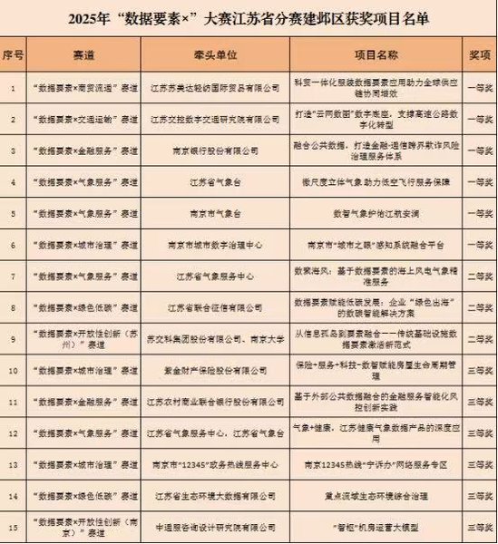 近日,2025年全国"数据要素x"大赛江苏省分赛决赛已圆满收官,本次赛事吸引了全省1299支队伍踊跃参与,共同角逐14条行业赛道的竞赛项目。其中,南京市建邺区共有15个项目在比赛中脱颖而出,荣获一等奖6个、二等奖3个、三等奖6个,一等奖获奖项目数量居全省各区县榜首。