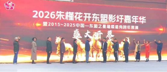 歌圩里的美妙声音都在影圩的浩瀚星辰里!2026年1月2日下午,2026朱槿花开东盟影圩嘉年华暨2015-2025中国—东盟之星璀璨星秀跨年展演开幕式在“北投·明月荟影视基地”南区大舞台盛大开幕,相关主承办单位及各界嘉宾代表近500人出席开幕式并品鉴了曌靓·娅王本草药食同源养生晚宴。